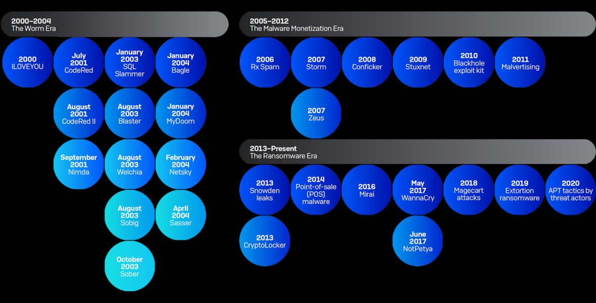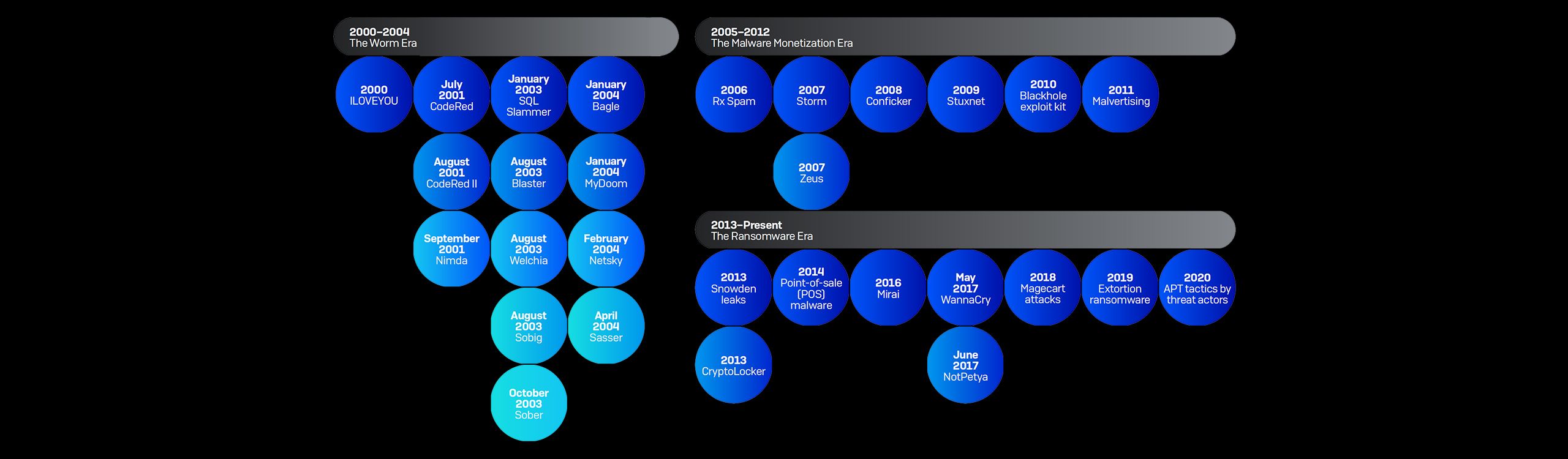 The turn of the millennium marked a milestone, when information security became a professional discipline and a bona fide industry. This timeline of threats and events represent significant, representative moments in the evolution of threat behavior.
